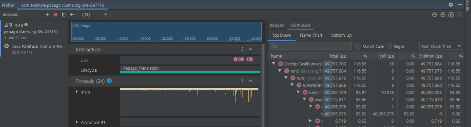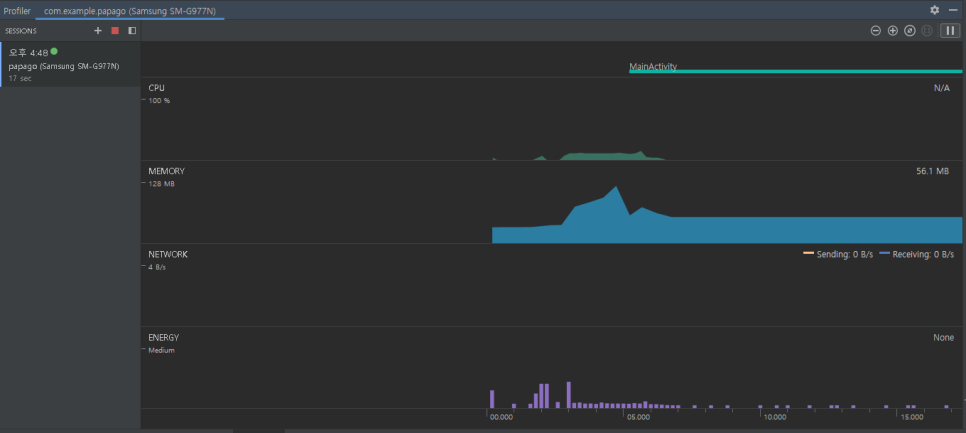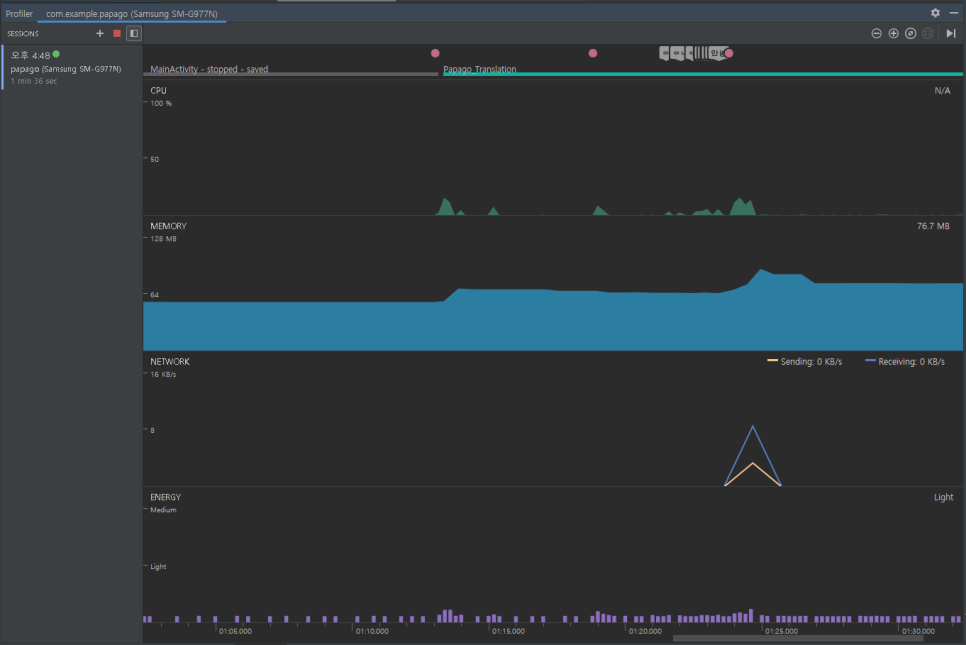 제가 앱에서 입력, 버튼 클릭 등의 이벤트를 발생시키니 Event 타임라인에 분홍색 점이 보이고~ CPU, MEMORY 사용량이 변하네요. 무엇보다 네이버 파파고 API를 사용해 통신을 했더니 NETWORK에 Sending, Receiving 량이 변경되는 것도 보이네요. CPU Profiler를 사용해서 앱에서 사용되는 세부정보를 확인하고 불필요한 데이터 사용을 줄이는(최적화) 것이 목적인가 봅니다.