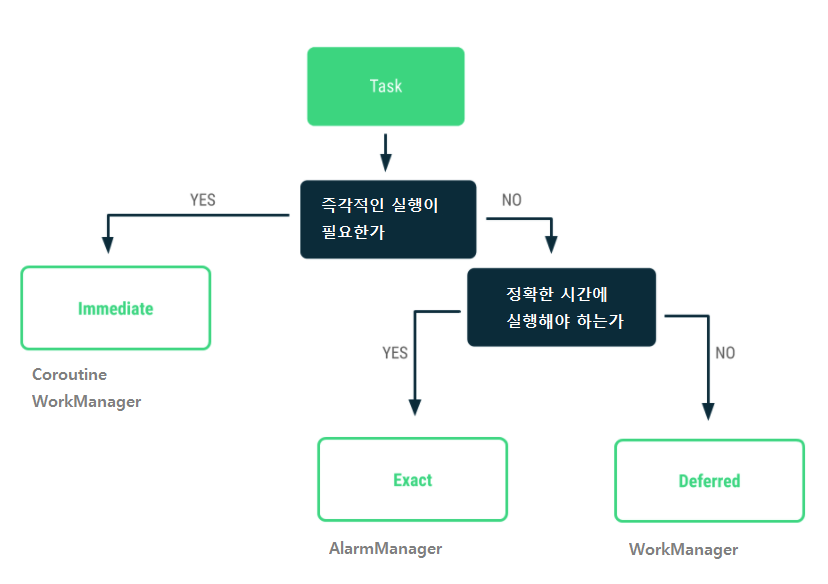 ๊ฐ๋จํ๊ณ ์งง์ ์์ / ๊ธด ์์ ๋ชจ๋ WorkManager๋ก ์ฒ๋ฆฌํ ์ ์๊ธฐ ๋๋ฌธ์ ๋ฐฑ๊ทธ๋ผ์ด๋ ์์ ์ ํด์ผํ๋ค๋ฉด WorkManager๋ฅผ ๋จผ์ ๋ ์ฌ๋ฆฌ๋ ๊ฒ์ด ์ข์ ๊ฒ ๊ฐ์ต๋๋ค.