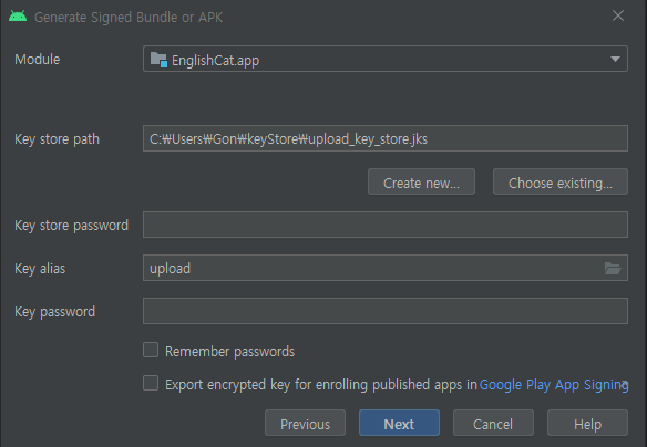 앱이 이미 기존 앱 서명 키로 서명되어 Google Play 스토어에 게시되어 4, 5번 작업을 건너뛰었다면 기존 키에 대한 정보를 입력하고 앱 서명 작업을 합니다.