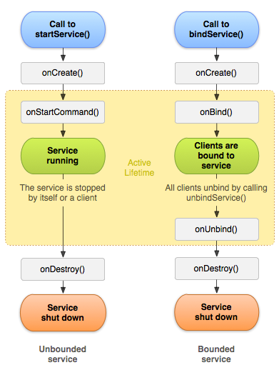 서비스는 Unbounded service(시작, 종료만 관여)와 Bounded service(연결 유지와 데이터 교환)로 구분됩니다.